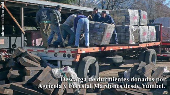 DESCARGA DE DURMIENTES DONADOS POR AGRÍCOLA Y FORESTAL MARDONES DESDE YUMBEL.