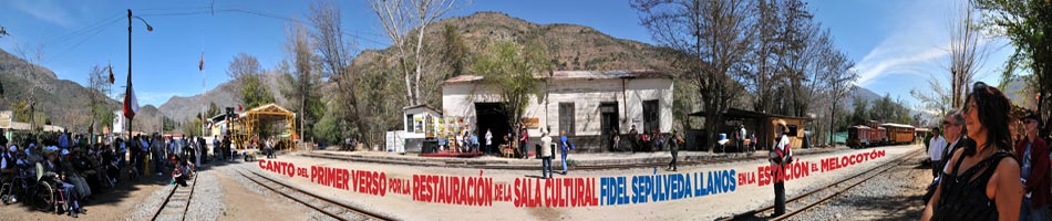 CON LA ASISTENCIA DE NUMEROSO PÚBLICO, PAYADORES, MÚSICOS; LA DEGUSTACIÓN DE RICAS EMPANADAS, BEBIDAS, VINITO; Y UNA SORPRENDENTEMENTE HERMOSA EXPOSICIÓN DE PINTURAS SOBRE EL TRENCITO -CON CUADROS PINTADOS POR ALGUNOS ANCIANOS DE LA FUNDACIÓN LAS ROSAS-, EL SÁBADO 24 DE SEPTIEMBRE, EN LA ESTACIÓN EL MELOCOTÓN -DONDE SE DESARROLLA EL PROYECTO AVE FÉNIX PARA LA RECUPERACIÓN DEL EX TREN MILITAR DEL CAJÓN DEL MAIPO-, SE LANZÓ EL PRIMER VERSO PARA LA FORMACIÓN DE LA SALA CULTURAL FIDEL SEPÚLVEDA LLANOS. OFRECEMOS EN ESTAS LÍNEAS LAS PALABRAS DICHAS EN ESA OCASIÓN POR EL DIRECTOR CULTURAL DEL PROYECTO, JUAN PABLO YÁÑEZ BARRIOS. PARA SABER SOBRE LA PERSONA Y OBRA DE FIDEL -AL QUE SU VIUDA SOLEDAD MANTEROLA, SU HIJA JAVIERA, SU YERNO PABLO Y LAS NIETECITAS VIOLETA Y BLANCA TAMBIÉN LE OFRECIERON SU HOMENAJE EN ESE ASOLEADO DÍA- INVITAMOS A VISITAR WWW.PROYECTOAVEFENIX.CL, SECCIÓN «NOTICIAS»(VER HACIENDO CLIC AQUÍ).